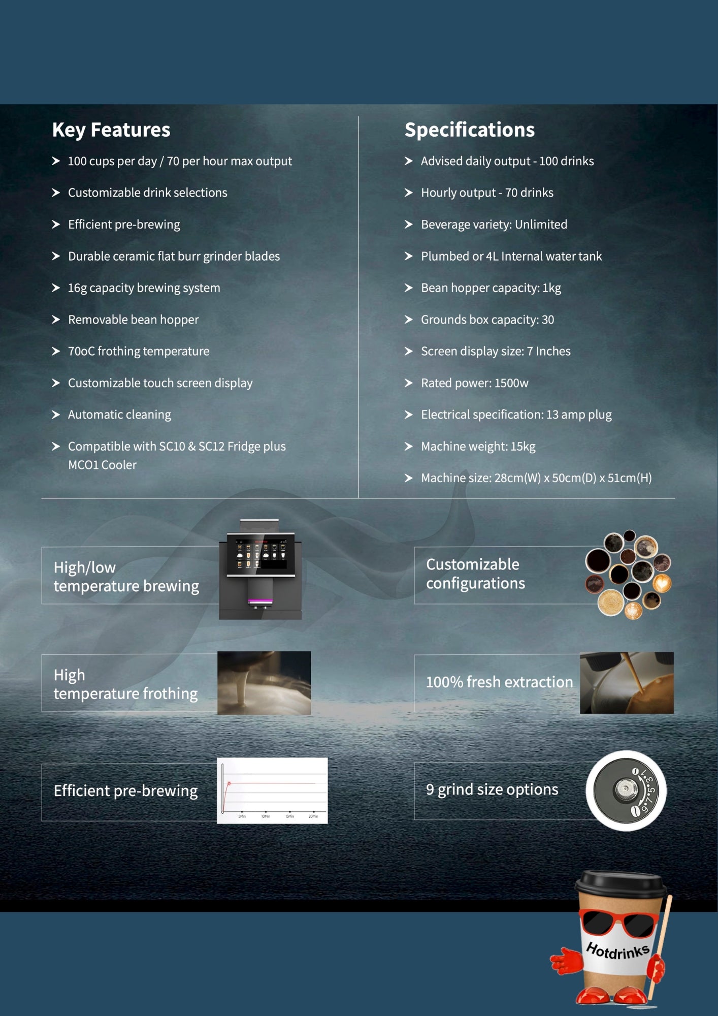 - 100 cups per day / 70 per hour max output